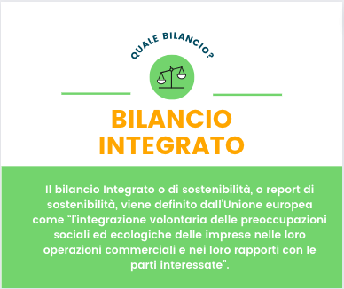 Il report o bilancio sociale è parte del documento unico, report o Bilancio Integrato. Nel Bilancio Integrato troviamo informazioni descrittive e finanziarie del bilancio di esercizio, e le informazioni descrittive e non finanziarie (questioni ambientali, sociali e di governance, ecc..) contenute nel c.d. ‘’Bilancio Sociale’’ o di ‘’Sostenibilità’’.